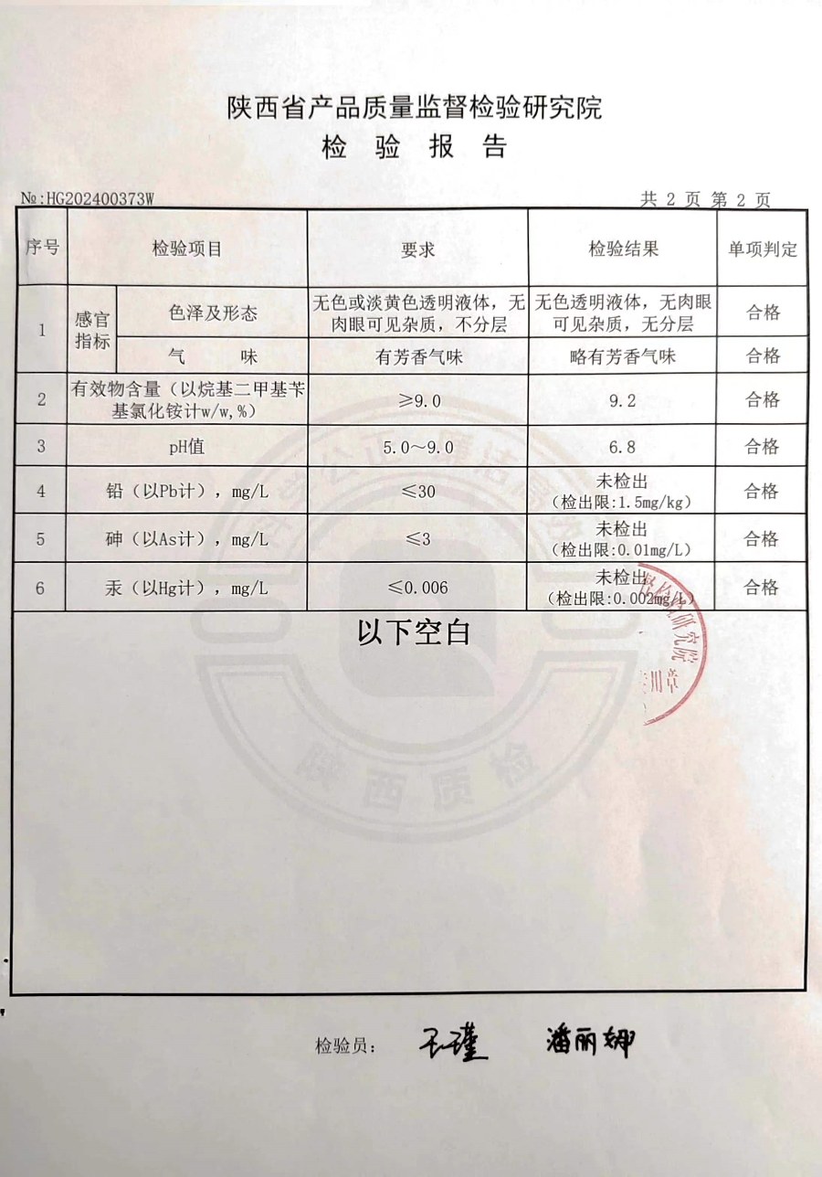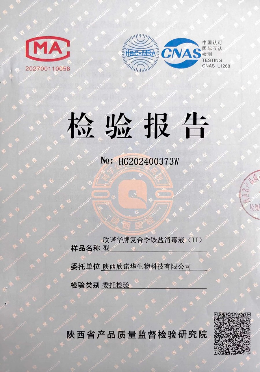 欣諾華牌復(fù)合季銨鹽消毒液檢測報告(2024年度)-陜西欣諾華生物科技有限公司