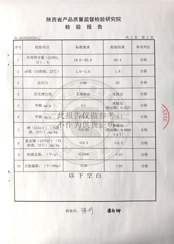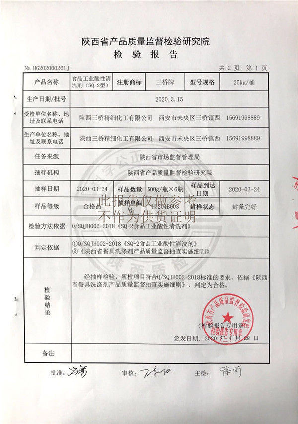 三橋牌食品工業(yè)酸性清洗劑檢測報告(2020年度)