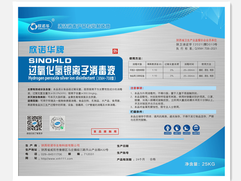 主要成分及含量:本品是以食品級過氧化氫、膠質(zhì)銀離子為主要有效成分的消毒液,過氧化氫含量≥35.0%;銀離子含量≥350mg/kg。可殺滅大腸桿菌,金黃色葡萄球菌及自然菌等。