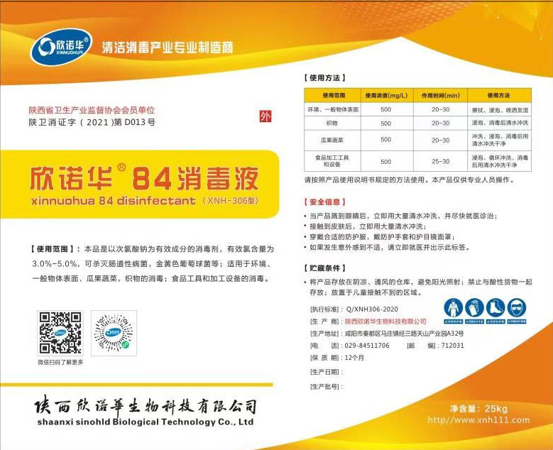 陜西欣諾華生物科技有限公司是衛(wèi)健委批準(zhǔn)的專業(yè)生產(chǎn)消毒產(chǎn)品的企業(yè),主要產(chǎn)品有:欣諾華牌84消毒液,欣諾華牌過氧化氫消毒液,欣諾華牌含氯泡騰消毒片,欣諾華牌75%酒精消毒液,欣諾華牌二氧化氯消毒劑,欣諾華牌含氯消毒粉,欣諾華牌免洗手消毒液,欣諾華牌免洗手消毒凝膠等產(chǎn)品的專業(yè)廠家,消毒產(chǎn)品衛(wèi)生許可證號(hào): 陜衛(wèi)消證字(2021)第D號(hào)013號(hào),客戶可放心使用。
