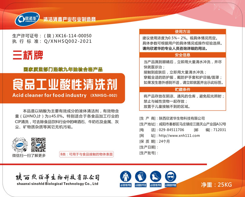 1.三橋牌食品工業(yè)酸性清洗劑(XNHSQ-2型)是一種無(wú)色或淡黃色透明、無(wú)泡、濃縮的液體高效酸性清洗劑,能強(qiáng)力去除頑固復(fù)雜的礦物質(zhì)污垢、乳垢,在堿性清洗完成后,用它作為酸性清洗劑,能有效防止奶石、石灰質(zhì)及其他礦物質(zhì)污垢的積聚。