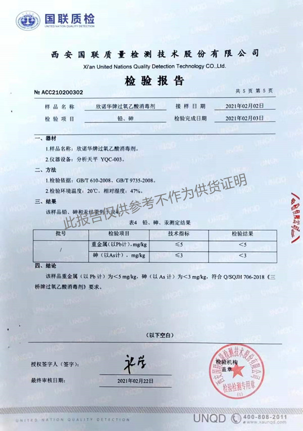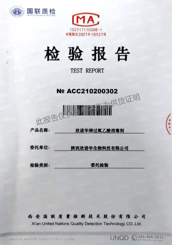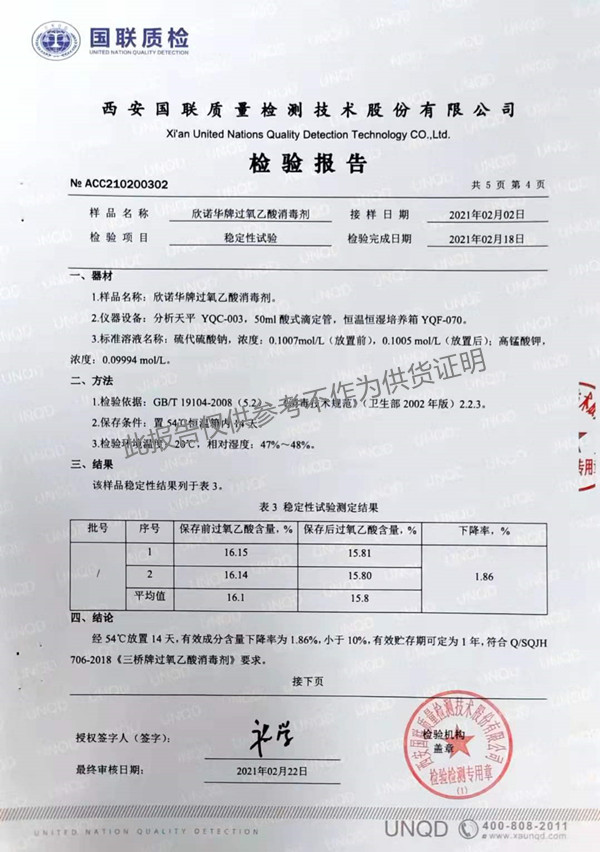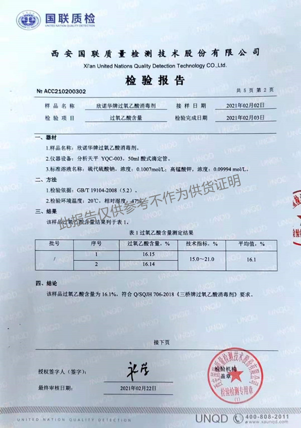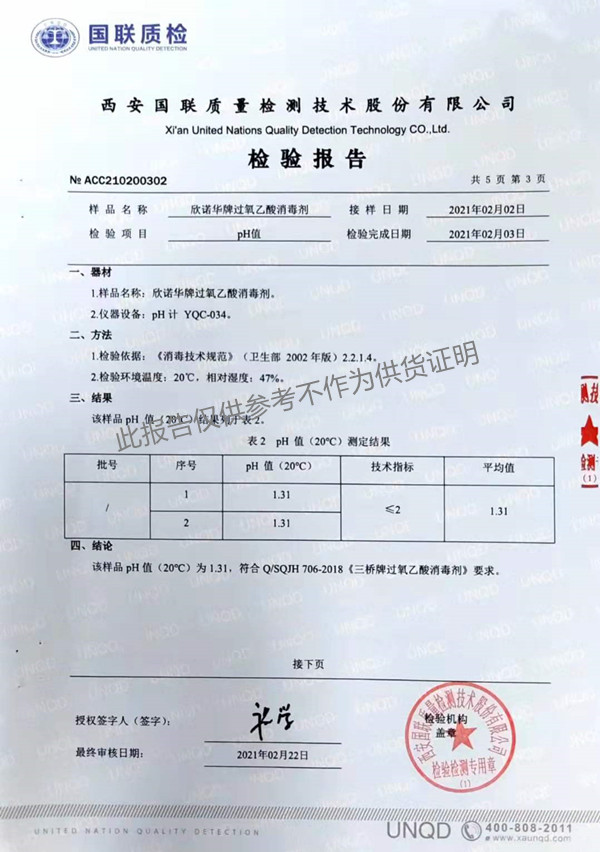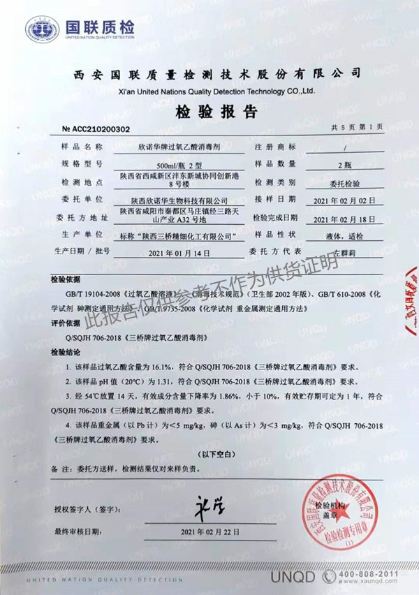 欣諾華牌過氧乙酸消毒劑(SQ-706型)檢測報告(2021年度)-陜西欣諾華生物科技有限公司