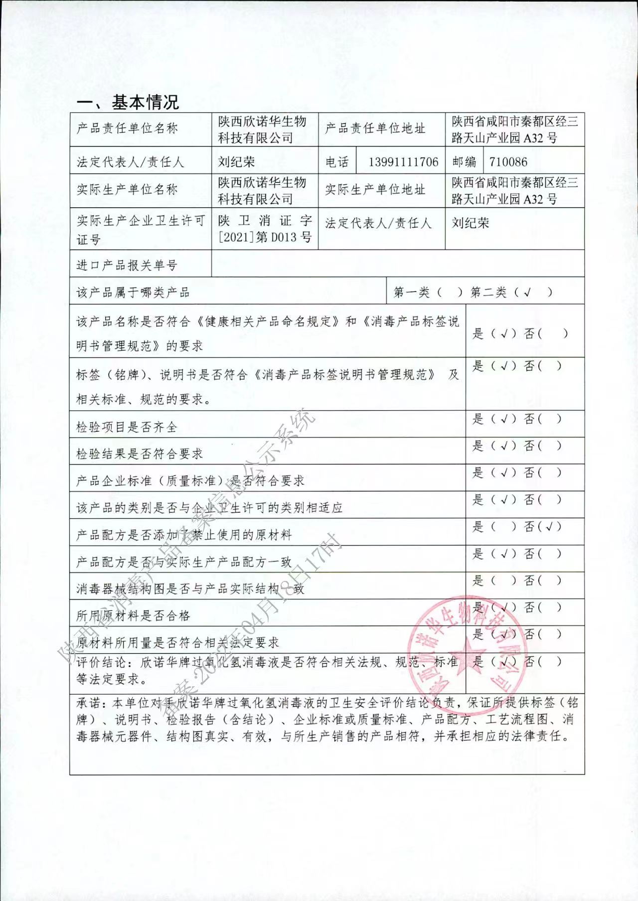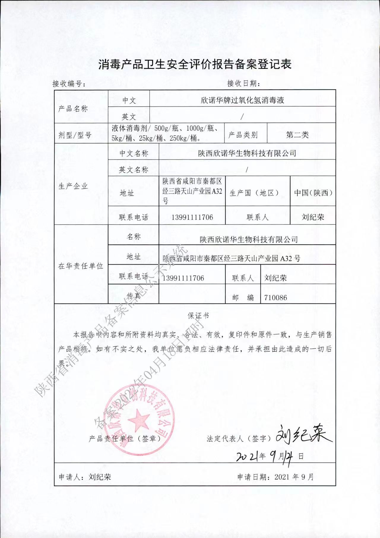 欣諾華牌(食品級雙氧水)過氧化氫消毒液安全評價報告-陜西欣諾華生物科技有限公司