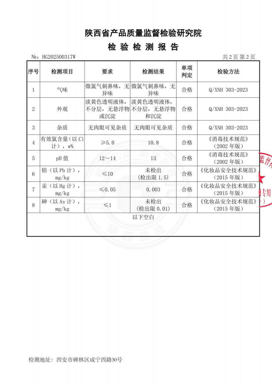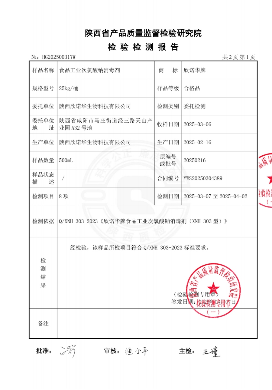 欣諾華牌食品級次氯酸鈉消毒劑檢測報告(XNH303型)(2025年度)-陜西欣諾華生物科技有限公司